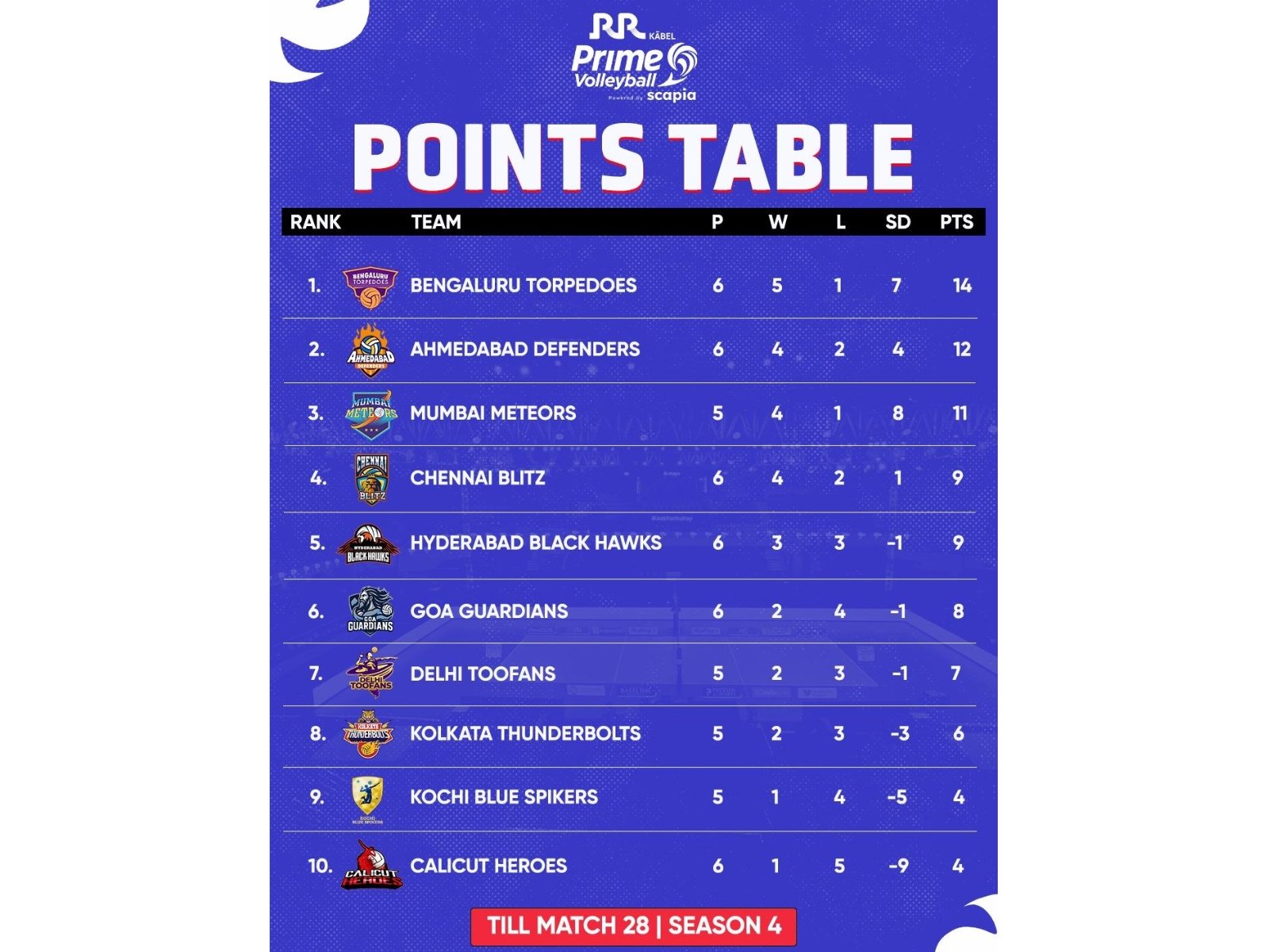 Hyderabad (Telangana) [India], October 23: Ahmedabad Defenders handed the Mumbai Meteors their first defeat of the season in the RR Kabel Prime Volleyball League powered by Scapia at the Gachibowli Indoor Stadium, Hyderabad, on Saturday. In a gripping contest, Ahmedabad edged past Mumbai 12–15, 15–7, 15–12, 21–20. Nandhagopal was adjudged the Player of the Match. With this win, Ahmedabad Defenders climbed to the second position in the table with 12 points from six games, while the Meteors slipped to third place.